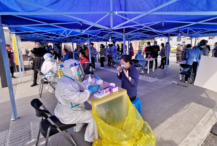 志愿者在核酸检测点热心引导辖区内市民排队检测