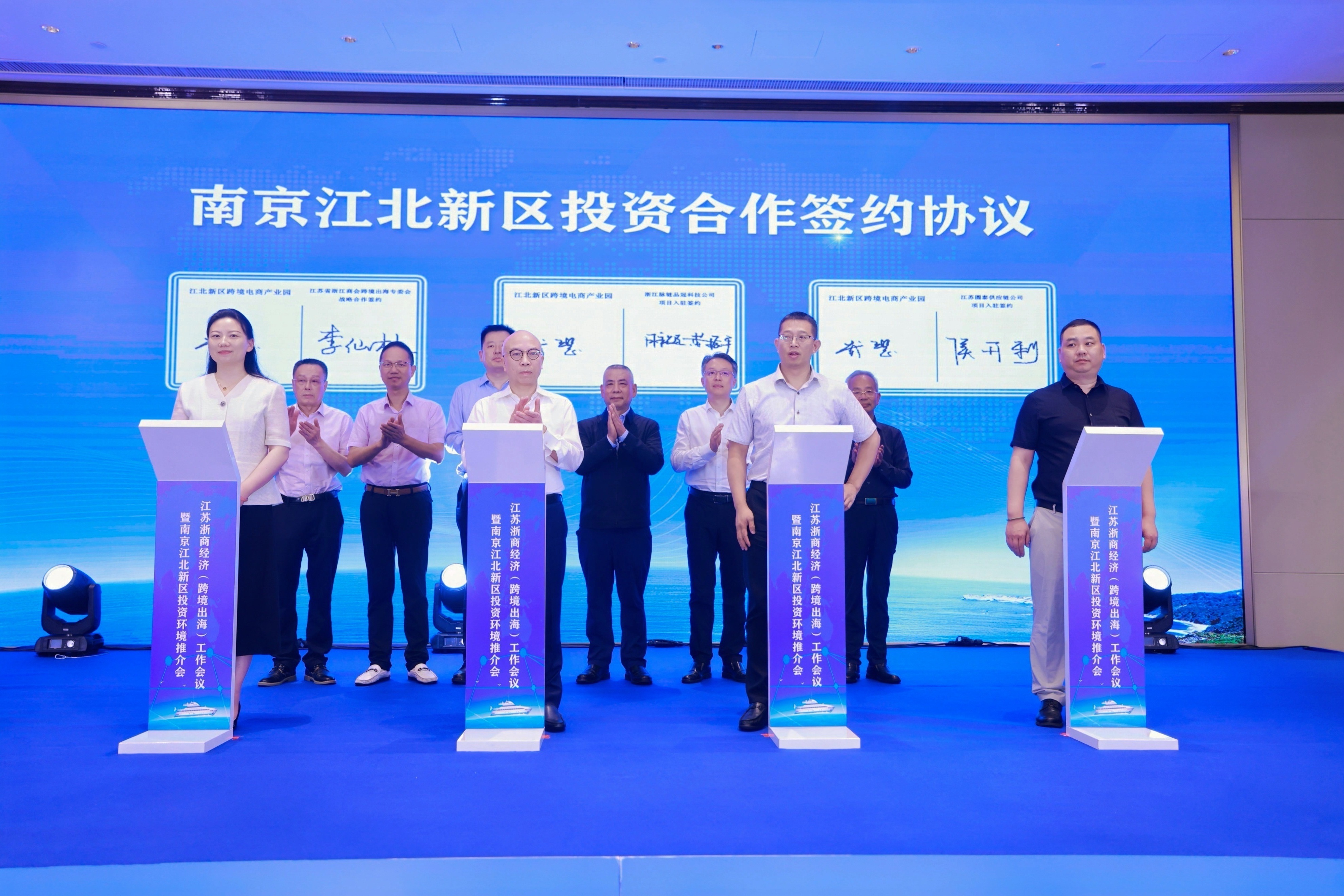 在江北新区投资合作签约仪式上,南京江北新区跨境电商产业园与 跨境出海专委会达成战略合作,同时与浙江脉链品冠科技、江苏圆泰供应链等多家企业签署入驻协议。合作项目的落地,将进一步促进产业资源整合,推动跨境出海企业高质量发展。