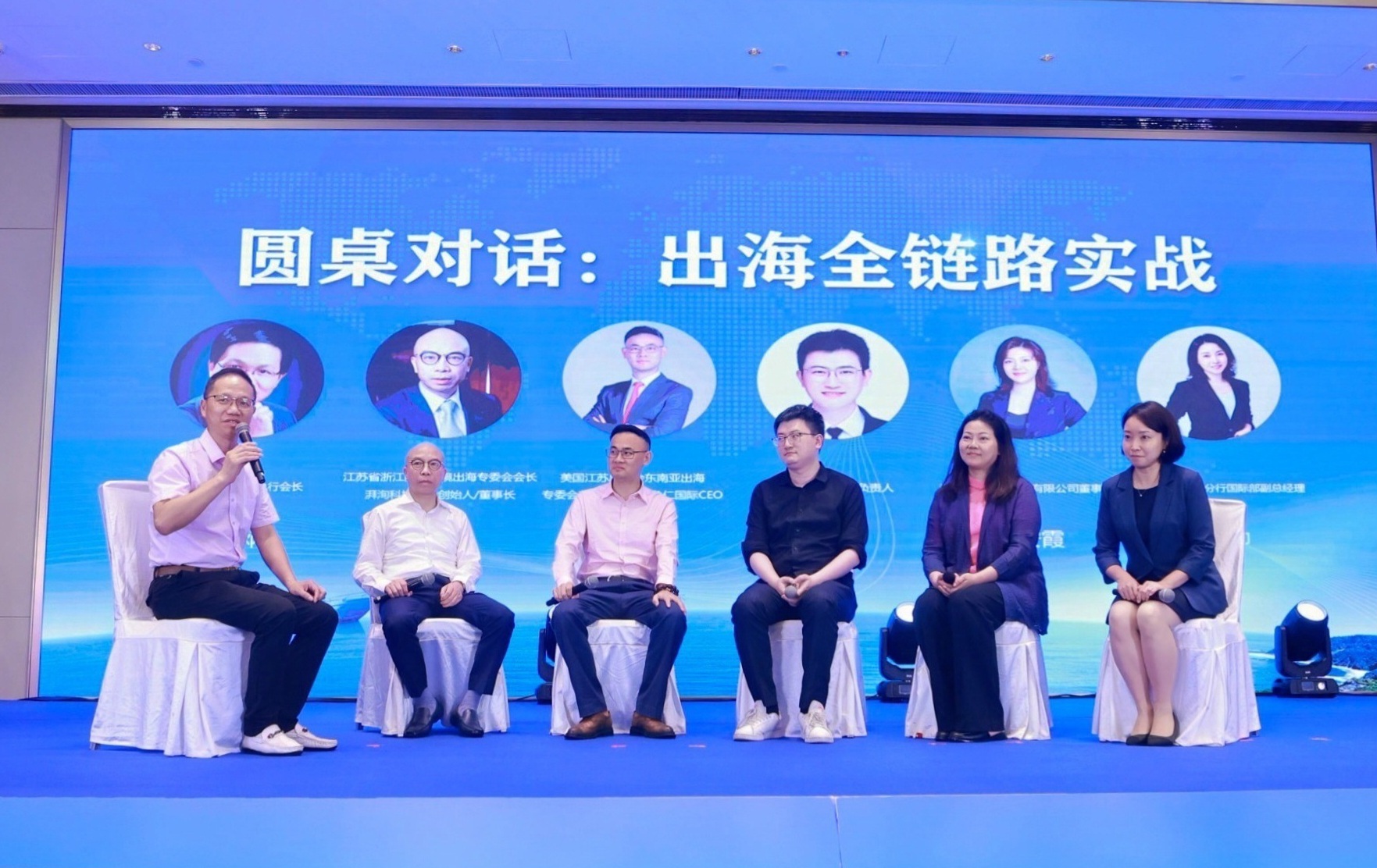 在"出海全链路实战"圆桌对话环节, 执行会长周才炳与湃洵科技、象仁国际、圆通国际、未迟数字技术、宁波银行的五位业界代表展开深入交流。代表们围绕企业出海面临的机遇与挑战展开热烈讨论。大家一致认为,在当前复杂多变的国际环境下,企业要更加注重风险防控,提升合规经营能力,同时要把握数字化发展机遇,创新商业模式,提升国际竞争力。代表们还就如何优化供应链管理、拓展海外市场、加强品牌建设等具体问题分享了宝贵经验。