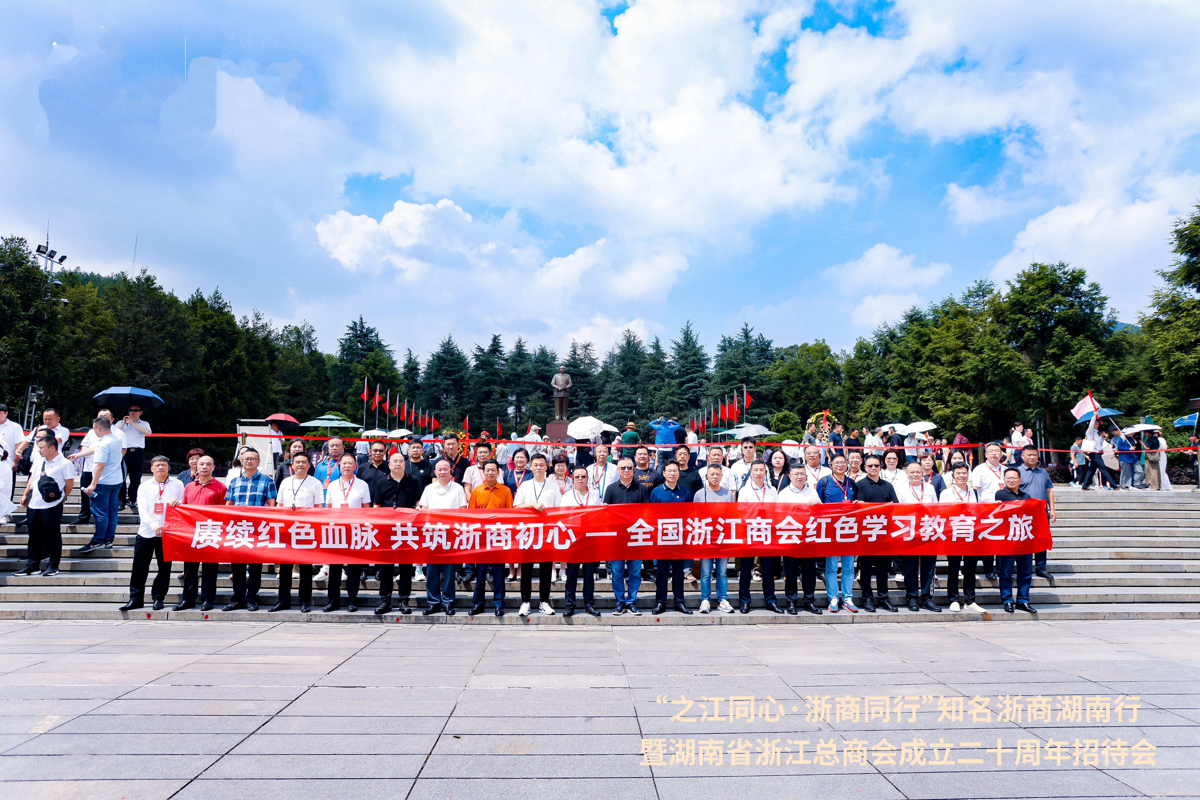7月12日,全国浙江商会会长、秘书长代表团及在湘浙商代表赴伟人故里韶山感悟革命精神,传承红色基因。在庄严肃穆的毛泽东广场,全体人员向毛泽东同志铜像敬献花篮。仪式结束后,全体人员参观了毛泽东同志纪念馆基本陈列《中国出了个毛泽东》,陈列全面系统展示了毛泽东同志为国家富强、民族振兴、人民幸福而不懈奋斗的一生。