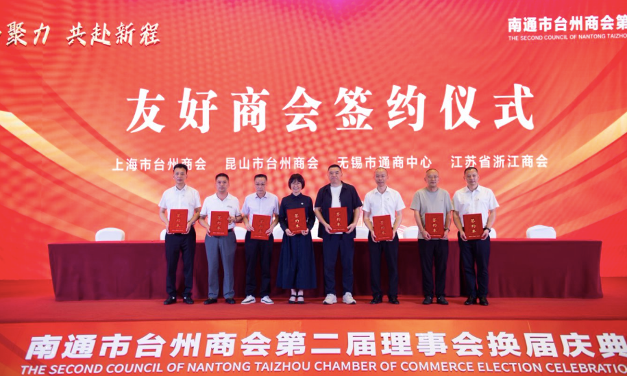 、上海市台州商会、无锡市通商中心、昆山市台州商会在会上与南通市台州商会共同签署友好合作协议,共同开启跨区域商会间资源共享、优势互补、合作共赢新格局。